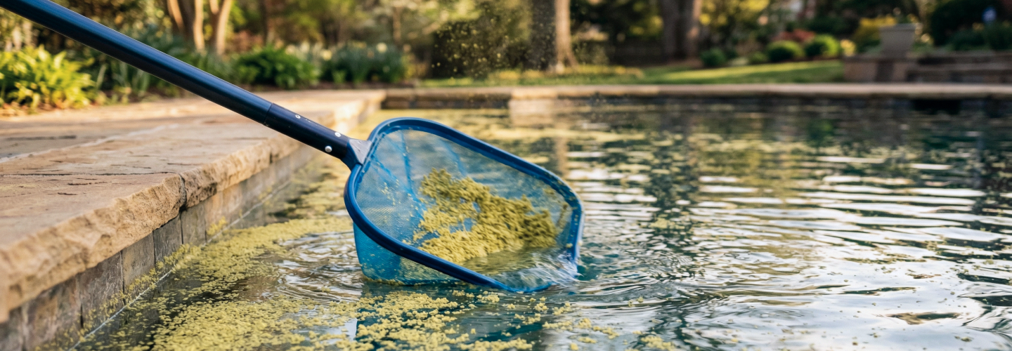 Quick test: skim the surface. If debris scoops up easily and doesn’t cling to walls, it’s likely pollen. If it sticks or returns after brushing, it’s algae.